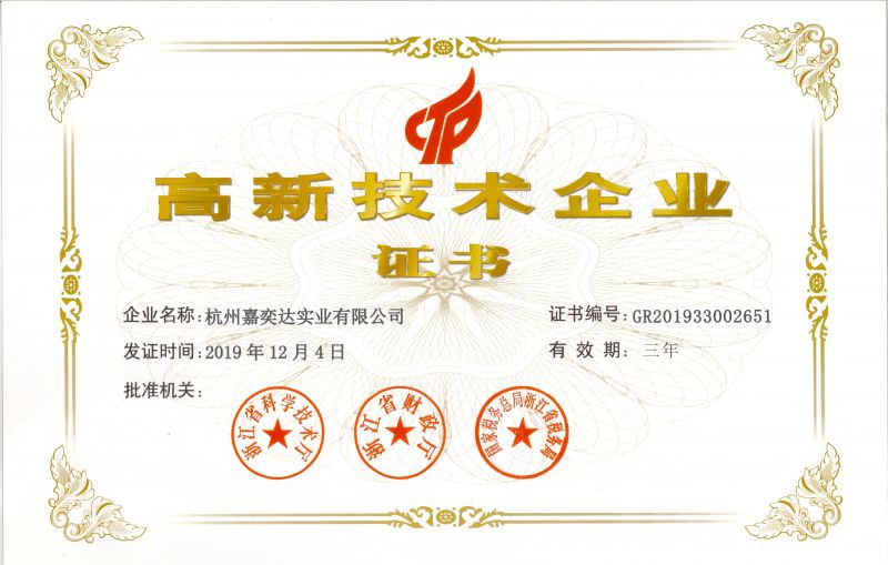 近日,由科學(xué)技術(shù)廳、財(cái)政廳和稅務(wù)局,聯(lián)合授予杭州嘉奕達(dá)實(shí)業(yè)有限公司為國家級“高新技術(shù)企業(yè)”的榮譽(yù)稱號并頒發(fā)證書。